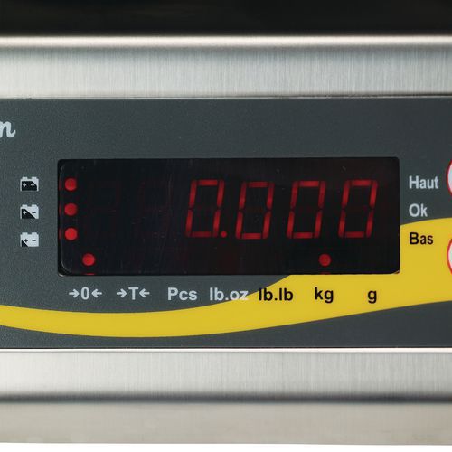 Balance compacte entièrement en acier inoxydable. Double écran avec affichage à leds rouges. Batterie rechargeable avec environ 80 heures d'autonomie. Dispose d'une protection contre les surcharges, la poussière et les projections d'eaux. Protection IP : IP 67 Garantie client : 3 ans