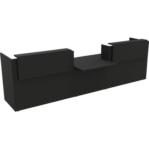 La banque d'accueil Filia avec sa tablette d'accueil centrée est parfaitement adaptée à l'accueil des personnes à mobilité réduite. Autonome ou associée pour composer un point d'accueil convivial. Plateau et façade : panneau mélaminé épaisseur 25 mm. Chants en ABS anti-choc 2 mm. Plateau prédécoupé pour le passage des câbles d'alimentation. Parement mélaminé épaisseur 38 mn assemblé en coupe d'onglet à 45 ° et servant de tablette d'accueil pour les visiteurs.