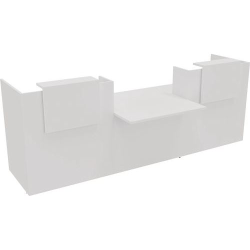La banque d'accueil Filia+ avec sa tablette d'accueil centrée est parfaitement adaptée à l'accueil des personnes à mobilité réduite. Autonome ou associée pour composer un point d'accueil convivial. Plateau et façade : panneau mélaminé épaisseur 25 mm. Chants en ABS anti-choc 2 mm. Plateau prédécoupé pour le passage des câbles d'alimentation. Parement mélaminé épaisseur 38 mn assemblé en coupe d'onglet à 45 ° et servant de tablette d'accueil pour les visiteurs.