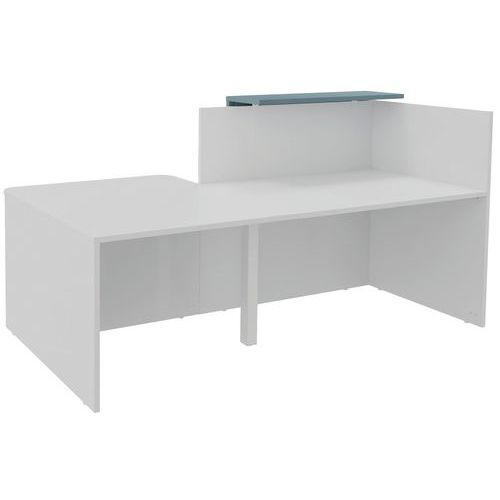 Banque d'accueil composée d'un module haut et d'un module bas avec tablette en débord pouvant accueillir des personnes à mobilité réduite Le module bas peut être positionné à droite ou à gauche au moment du montage Panneaux de particules de 25 mm d'épaisseur surface antibactérienne, composé de bois issus de forêts durablement gérées. Chaque plan de travail est pré-percé afin d'accueillir au maiximum jusqu'à 2 obturateurs passe-cables (vendus en option) Chant ABS anti-choc, assemblage par inserts métalliques Classement au feu M3 Finition mélaminé uni ou ton bois