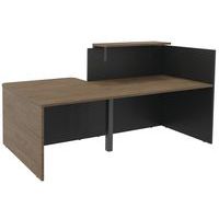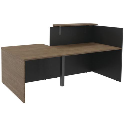 Banque d'accueil composée d'un module haut et d'un module bas avec tablette en débord pouvant accueillir des personnes à mobilité réduite Le module bas peut être positionné à droite ou à gauche au moment du montage Panneaux de particules de 25 mm d'épaisseur surface antibactérienne, composé de bois issus de forêts durablement gérées. Chaque plan de travail est pré-percé afin d'accueillir au maiximum jusqu'à 2 obturateurs passe-câbles (vendus en option) Chant ABS anti-choc, assemblage par inserts métalliques Classement au feu M3 Finition mélaminé uni ou ton bois