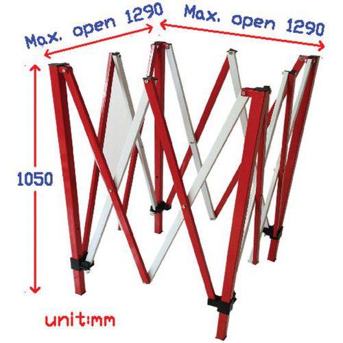 Barrière de chantier extensible à barreaux articulés par rivets. Prend très peu de place une fois pliée. Convient pour un usage intérieur et extérieur.