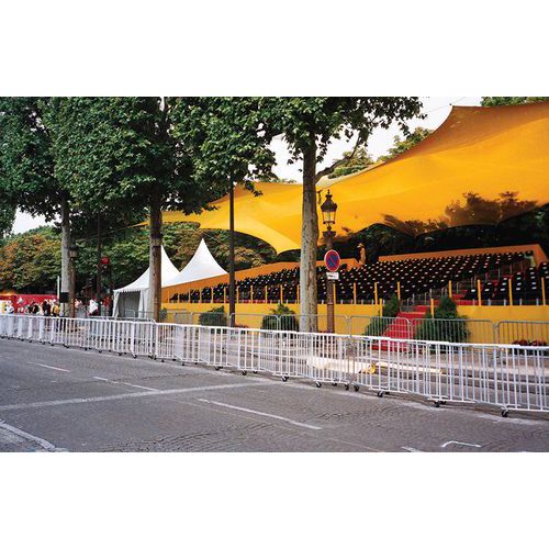 Barrière extensible autoportante et robuste. Supporte de fortes pressions : convient à tout événement qui attire du public (manifestations sportives et culturelles, concerts, salons, stades, parcs d’attraction, …). Simple d’utilisation et de stockage: facile et rapide à mettre en place. Se déplie par roulettes et se stabilise en 5 secondes. Blocage des roulettes : par simple pression sur le frein. Axe et visserie en inox : résiste aux intempéries sans risque de rouille. Les roulettes sont composées de : roues en caoutchouc bleu, de chapes en acier zingué, embouties et pivotantes.