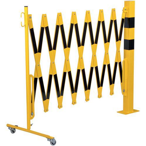 Barrière extensible en acier sur roulettes et poteau carré pour une délimitation temporaire. Bandes bi-colores pour plus de visibilité. Convient uniquement pour une utilisation intérieur. Facile à manipuler, stocker et utiliser grâce à ses roulettes avec frein. Certificat du TÜV. Platine 120 x 195 mm.