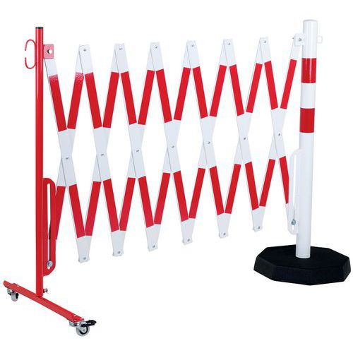 Barrière de protection extensible sur roulettes avec freins d'un côté et poteau de protection de l'autre. Permet de délimiter temporairement une zone interdite d'accès. Le poteau permet une mise en place stable des barrières dans les endroits où une fixation murale n’est pas possible. Poteau avec socle lourd de 8 kg. Certificat du TÜV.