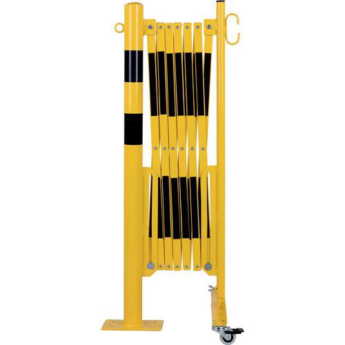 Barrière extensible en acier sur roulettes et poteau rond. Bandes bi-colores pour plus de visibilité. Convient uniquement pour une utilisation intérieur. Facile à manipuler, stocker et utiliser grâce à ses roulettes avec frein. Certificat du TÜV. Platine 120 x 195 mm.