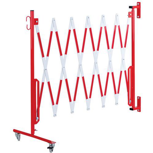 Barrière extensible en acier sur roulettes et fixation murale pour une délimitation temporaire. Bandes bi-colores pour plus de visibilité. Convient uniquement pour une utilisation intérieur. Facile à manipuler, stocker et utiliser grâce à ses roulettes avec frein. Certificat du TÜV.