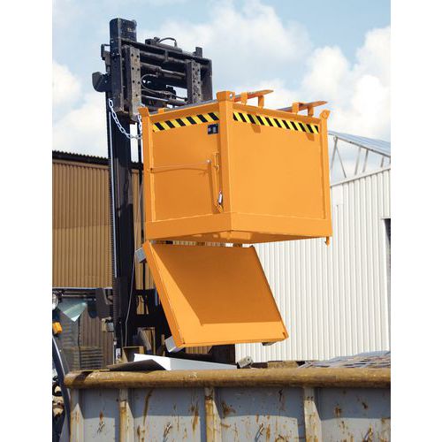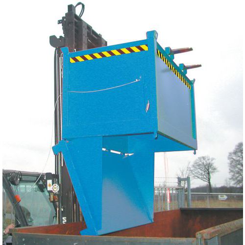 Ouverture depuis la cabine à l’aide d’un câble. Benne équipée d’un pare-chocs en caoutchouc pour amortir l’impact du fond ouvrant lors de la vidange. Fermeture du fond automatique lors de la pose au sol. Construction robuste pour une longue durée de vie.