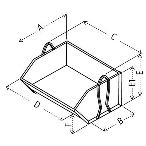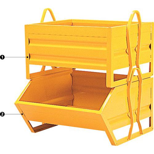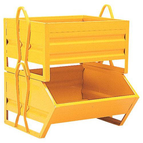 Benne fermée gerbable. Fixation facile à l'aide d'un palan. Déplacement aisé à l'aide d'un chariot élévateur ou transpalette. Grande résistance et adaptation aux charges lourdes. Gerbage compatible avec la benne ouverte, équipée d'un bec.