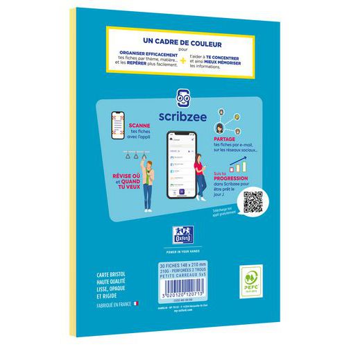 Un cadre de couleur vous permet d'organiser efficacement vos fiches par thème, matière. Vous conservez la lisibilité de vos notes grâce au contraste du fond blanc. Ces fiches sont déclinées dans 4 couleurs de cadres. La couverture du bloc de fiches bristol est enveloppante et protège vos fiches. Ce format bloc-notes vous permet de les transporter facilement dans votre sac, sans les abîmer. En carte 210g résistante et de haute qualité, les fiches bristol OXFORD sont lisses et opaques pour le confort de l'écriture, rigides pour le classement et la tenue dans le temps. Format A6 facile à emporter partout.