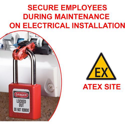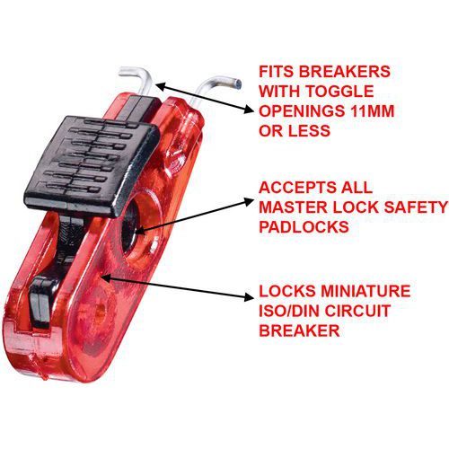 Le dispositif breveté s'adapte aux disjoncteurs munis d'interrupteur à bascule de 11 mm ou moins et fonctionne avec tous les cadenas et crochets de consignation Master Lock.