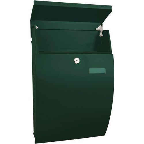 - Boîte aux lettres murale en acier galvanisé thermolaqué, équipée d'une serrure à cylindre et d'un support pour petite plaque signalitique.