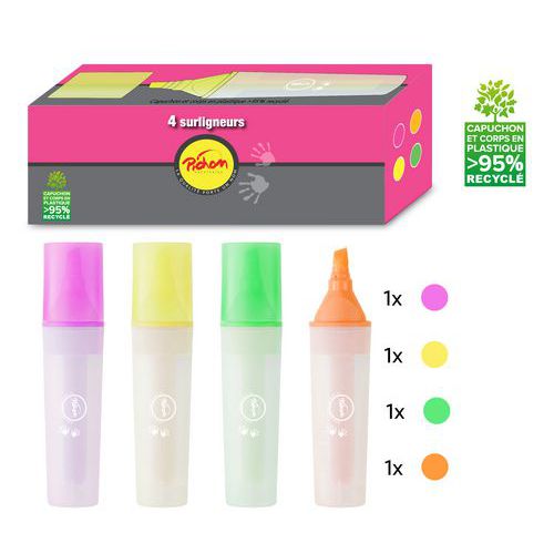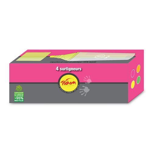 | Intitulé du produit | Boite de 4 surligneurs, Encre coloris: Assorti, Trait largeur mini: 2 mm, Trait largeur maxi: 5 mm |