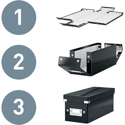Boîte de rangement pour CD. Se démonte lorsqu'elle n'est pas utilisée. Porte-étiquette pour l'indexation. Fabriquée à partir de carton qualitatif, très résistant. Surface laminée et coins en métal pour plus de protection. Design contemporain qui s'adapte parfaitement à la maison et au bureau.