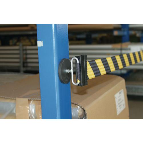 Boîtier à sangle pour une fixation murale magnétique. Réception de la sangle via le récepteur mural aimanté. Orientable pour un balisage dans toutes les directions. Frein centrifuge intégré pour éviter le retour trop rapide de la sangle. Rembobinage freiné en cas de relâchement accidentel.