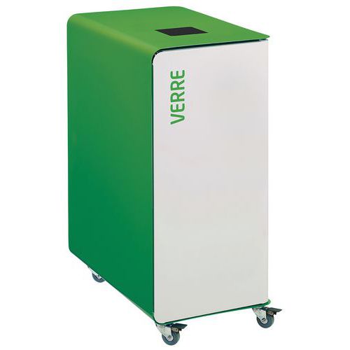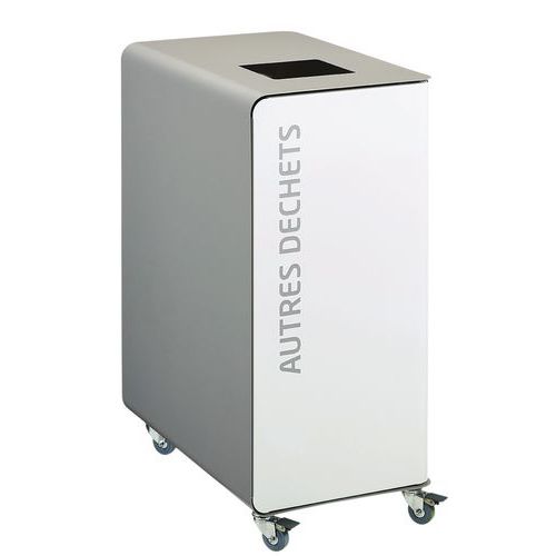 100% personnalisable Fonctionnel mobile, rotation à 360° Facilité du vidage du sac grâce au support sac sur glissière, permettant la prévention des TMS Identification du type de tri (plaques de couleur avec ouverture calibrée, texte de la couleur du tri en français, braille et autre langue disponible sur devis) Acier poudré anti-UV Système d'ouverture push/pull grâce à son loqueteau mécanique Porte à ouverture frontale push sérigraphiée Ouverture calibrée (carré : 170 x 170 mm) et identification du type de tri Support sac intégré en inox AISI 304 18/10 sur glissière en acier zingué 4 roulettes pivotantes Ø50mm : 2 avec frein + 2 sans frein