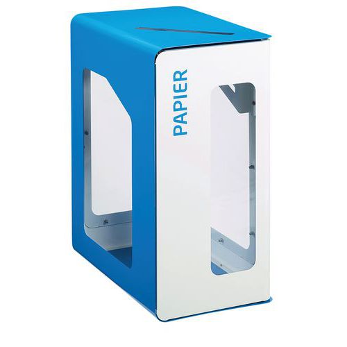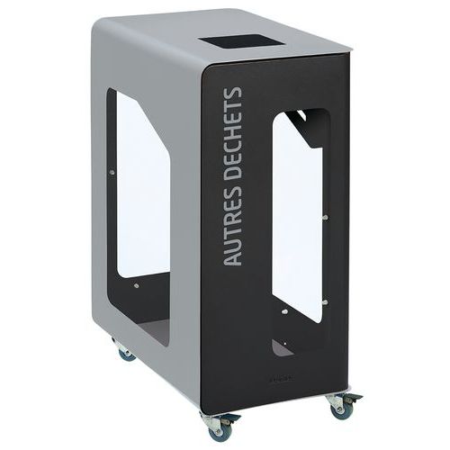 Vigipirate : permet la visualisation des déchets 100% personnalisable Fonctionnel mobile, rotation à 360° Facilité du vidage du sac grâce au support sac sur glissière, permettant la prévention des TMS Identification du type de tri (plaques de couleur avec ouverture calibrée, texte de la couleur du tri en français, braille et autre langue disponible sur devis) Acier poudré anti-UV Système d'ouverture push/pull grâce à son loqueteau mécanique Porte à ouverture frontale push sérigraphiée Ouverture calibrée (carré : 170 x 170 mm) et identification du type de tri Support sac intégré en inox AISI 304 18/10 sur glissière en acier zingué 4 façades trasnparentes en polycarbonate, résistantes aux chocs 4 roulettes pivotantes Ø50mm : 2 avec frein + 2 sans frein