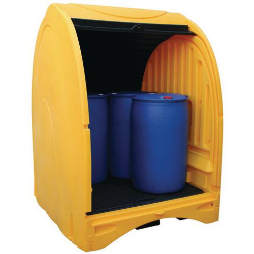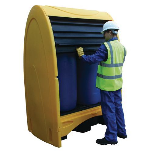 Box de stockage rigide double paroi résistant à la corrosion chimique. Accès facile des 2 côtés via rideaux coulissants côtelés, souples et résistants. Manutention à vide par transpalette ou chariot élévateur. Bonne hauteur interne.