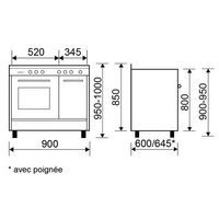 - Piano de cuisson - Four électrique - 7 modes de cuisson dont Maxi Gril pulsé et Chaleur tournante - Minuteur sonore 60 minutes - Eclairage - Panneaux catalytiques autonettoyants - Gradins fils - Contre-porte plein verre avec verre démontable - Porte 2 vitres - Plan de cuisson inox - Allumage de la table électronique ''bouton'' - 5 brûleurs dont 1 triple couronne 3,8 kW - Sécurité gaz par thermocouple - Grilles fonte - Départ de crédence - Coffre de rangement chauffe-plat - Plinthes cache-pieds noires de série - Ventilateur tangentiel aspiré : l'air chaud du four est rejeté sur l'arrière, pas de souffle d'air en façade - Homologué pour être encastré entre deux meubles de cuisine, selon la norme UNI EN 30-1-1 classe 2 - Finition noir brillant.