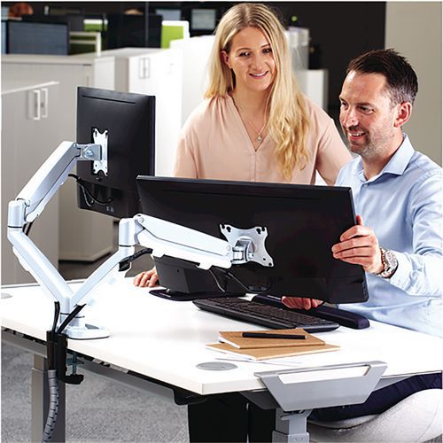 Bras porte-écran double ajustable à la simple pression du doigt.