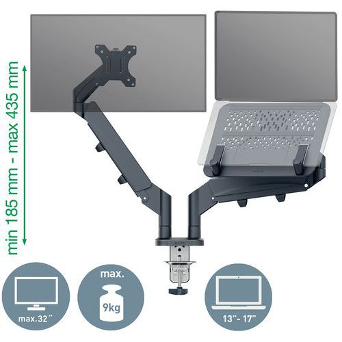 | Intitulé du produit | Bras double pour écran et ordinateur portable, Charge maxi: 9 kg, Coloris: Gris foncé, Hauteur mini: 185 mm |