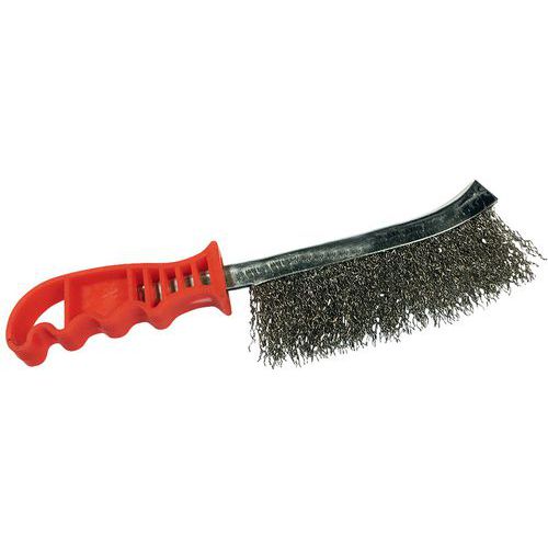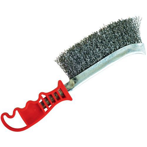 Brosse métallique à manche universel - Manutan Existe avec 3 type de fil différents. Fil acier, facilite le décrassage de pièce rouillées. Fil laiton pour un brossage délicat sur des métaux fragiles. Fil inox pour les travaux difficiles, ne laisse aucun dépot de particules oxydantes.