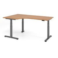 Bureau assis-debout à angle 90° - 200x120cm. Dispose d'un plateau de table. Bureau à rebord renforcé monté à droite ou gauche. Hauteur de travail de 63,5 à 128,5cm. Réglage électrique progressif de la hauteur.