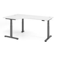 Bureau assis-debout à angle 90° - 200x120cm. Dispose d'un plateau de table. Bureau à rebord renforcé monté à droite ou gauche. Hauteur de travail de 63,5 à 128,5cm. Réglage électrique progressif de la hauteur.