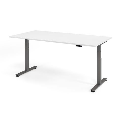 Bureau assis-debout série XDSM - 200x100 cm. Dispose d'un plateau de table. Bureau à rebord renforcé monté à droite ou gauche. Hauteur de travail de 63,5 à 128,5cm. Réglage électrique progressif de la hauteur.