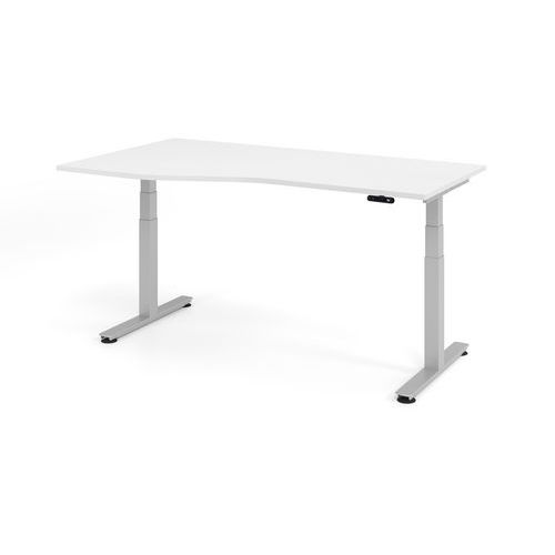 Bureau asymétrique assis-debout série XDSM - 160x100cm. Dispose d'un plateau de table. Bureau à rebord renforcé monté à droite ou gauche. Hauteur de travail de 63,5 à 128,5cm. Réglage électrique progressif de la hauteur.
