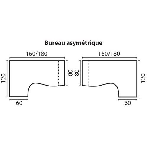 Bureau asymétrique Quatuor pieds L Structure panneau de particules revêtu mélaminé décor. Pieds L base bois avec insert bois sérigraphie alu. Piètement équipé de vérins de réglage d'aplomb. Retour profondeur 120 cm à gauche ou à droite. A compléter d'un pied de renfort, d'un plateau d'extension avec pieds ou d'un caisson hauteur bureau vendus séparément. Livré prêt à monter avec notice.