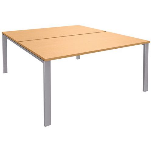 Plateau en panneau de particules de bois densité 700 kg/m3 finition mélaminée haute densité classé au feu M3. Epaisseur 25 mm chants ABS 2 mm coloris assortis au plateau. Pied en arche tube acier section 70x30 mm ép. 2 et 3 mm.. Vérins de réglage de mise à niveau. Espace entre les 2 plateaux pour le passage de câbles ou la pose d'ecran de séparation.