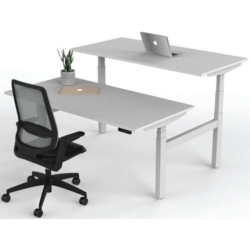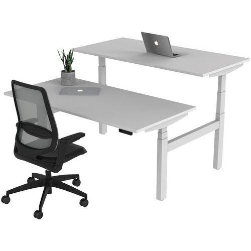 Bureau double en bench pour optimiser l'échange de vos collaborateurs. Séparé d'un espace vous permettant de faire passer des câbles, le bureau est réglable en hauteur grace à un système électrique placé sur le côté droit du bureau. Pieds en H.
