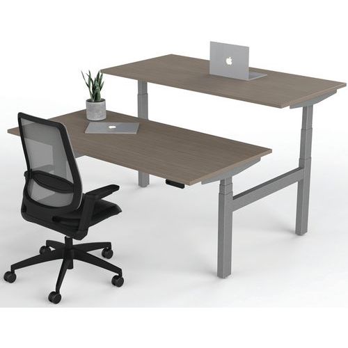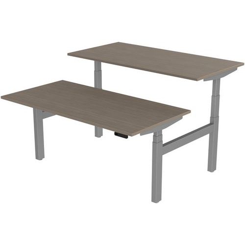 Bureau double en bench pour optimiser l'échange de vos collaborateurs. Séparé d'un espace vous permettant de faire passer des câbles, le bureau est réglable en hauteur grace à un système électrique placé sur le côté droit du bureau. Pieds en H.