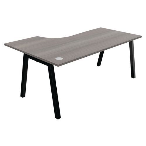 Plateau mélaminé ép. 25 mm équipé d'un obturateur passe-câble Chant ABS antichoc 2 mm Piétement métallique en arche composé de pieds carrés de section 50 x 50 mm obliques, finition époxy laqué. Vérins de stabilisation pour compenser les défauts de planéité du sol (course de réglage 10 mm)
