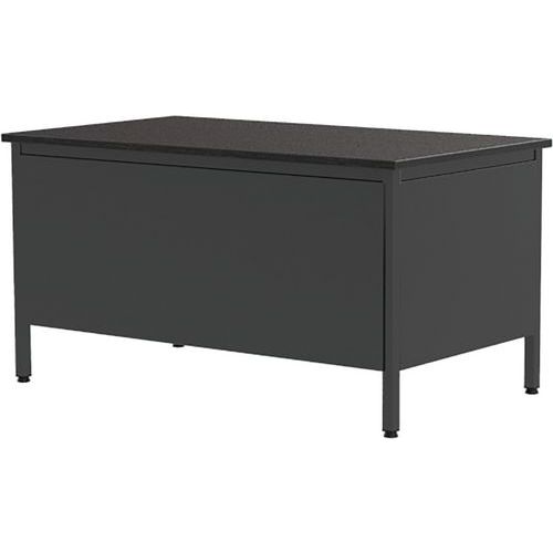 Bureau demi ministre avec caisson de la gamme Confort 2. Piètements en tubes carrés de 35x35x2 mm avec renfort en métal dans les coins. Piètements sur vérins réglables en synthétique. Structure métallique solide en tôle de 1.5 mm. Les parties métalliques sont peintes en poudre époxy-polyester. Hauteur bureau fixe: standard à 75 cm (incl. top de 25 mm).