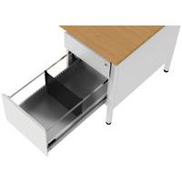 Bureau demi ministre avec caisson 2 tiroirs de la gamme confort 2. Piètements en tubes carrés de 35x35x2 mm avec renfort en métal dans les coins. Piètements sur vérins réglables en synthétique. Structure métallique solide en tôle de 1.5 mm. Les parties métalliques sont peintes en poudre époxy-polyester. Hauteur bureau fixe : standard à 75 cm (incl. top de 25 mm).