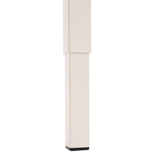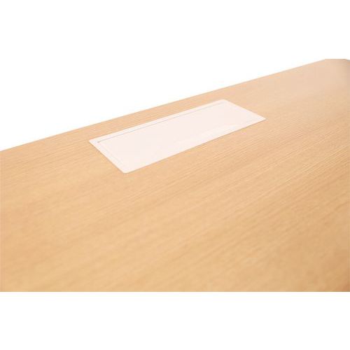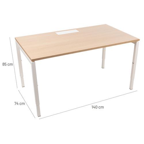 Bureau droit réglable en hauteur au niveau des pieds. Plateau mélaminé 25mm et chants ABS de 2mm. 2 traverses de maintien en tube métallique de 40x20mm. Structure des pieds droit en métal 40x40mm avec vérins en plastique pour le nivellement. Plateau muni d'un passage de câble avec trappe pour aider à la gestion des câbles.