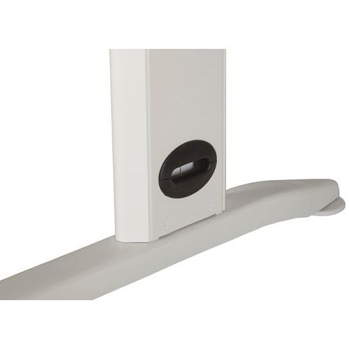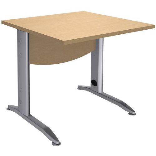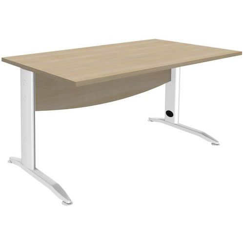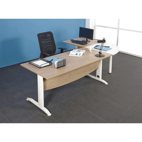Structure métal revêtu époxy. Plateau panneau mélaminé épaisseur 25 mm. Equipé d'un voile de fond en aggloméré épaisseur 16 mm de forme courbe Piètement L métallique équipé de vérins de réglage. Fabrication française. Livré prêt à monter avec notice.