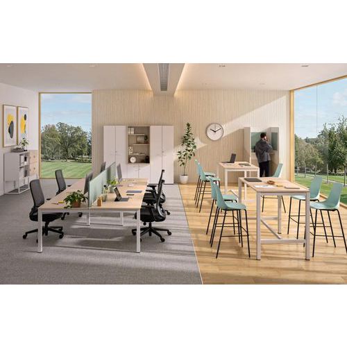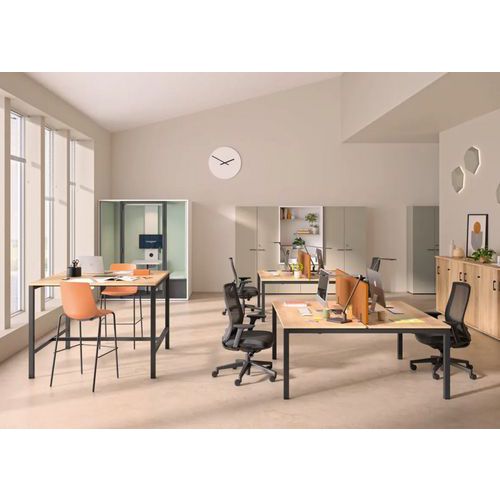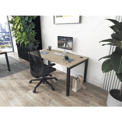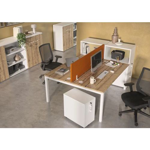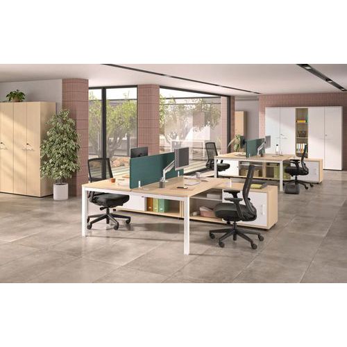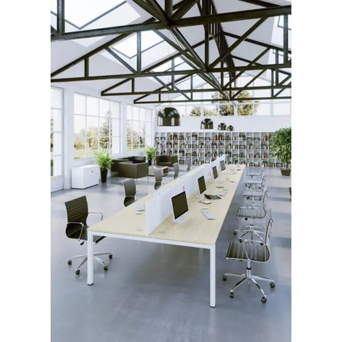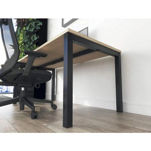 Bureau droit Arche A1 d'une hauteur de 72 cm. Chants droits antichocs épaisseur 2 mm. Voile de fond en option. Pieds arche métallique finition époxy coloris aluminium, de section 5 x 5 mm. Vérins de réglage d'aplomb. Livré prêt à monter avec notice. Structure métal avec poutre autoportante. Plateau panneau de particules bois haute densité épaisseur 25 mm, revêtu mélaminé. Deux obturateurs diamètre 8 mm pour passage de câbles.