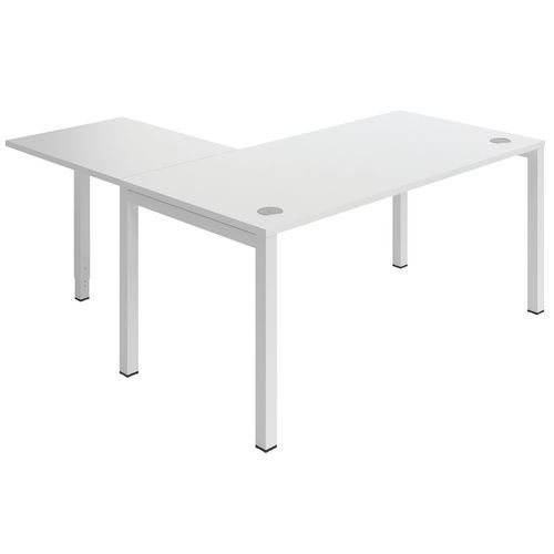 Bureau droit avec extension Astro Arche structure métal avec poutre autoportante pour plus de solidité. Plateau panneau de particules bois haute densité épaisseur 25 mm, revêtu mélaminé. Chants ABS antichocs épaisseur 2 mm. Plateau équipé de 2 obturateurs Ø 80 mm pour le passage de câbles. Retour 80 x 60 cm positionnable à droite ou à gauche. Pieds arche métallique finition époxy de section 50 x 50 mm. Vérins de réglage d'aplomb. Livré prêt à monter avec notice. Garantie client : 10 ans Montage : À monter