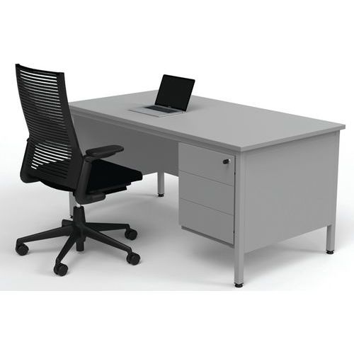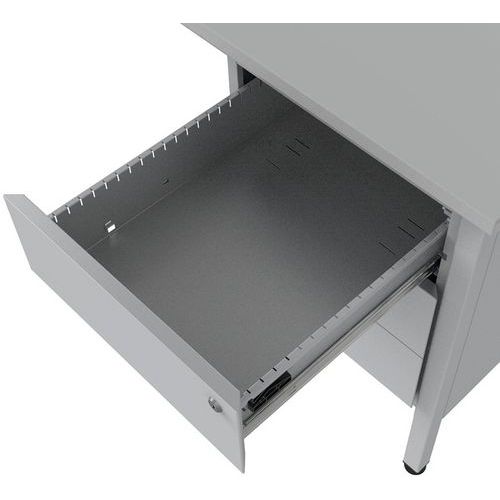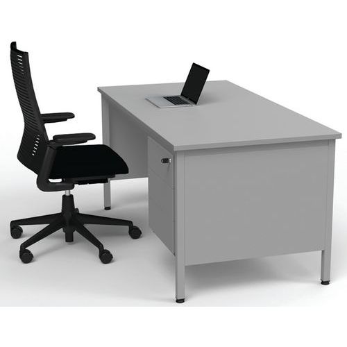 Bureau robuste et intemporel. Plateau antireflet haute résistance (ép.25 mm). Verrouillage central du caisson. Le caisson peut s'installer à droite comme à gauche. Piétements équipés de vérins de réglage. Cadre autoporteur et voile de fond métallique.