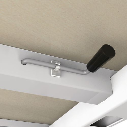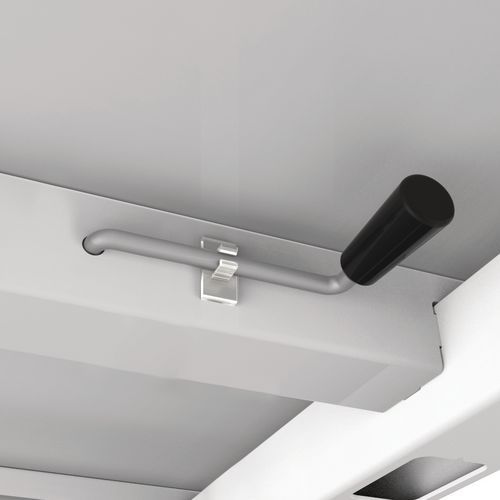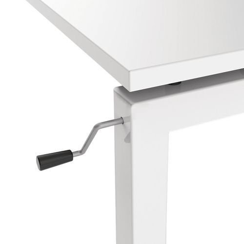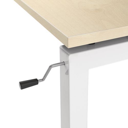 Bureau droit avec piètement en U. Manivelle de réglage pour ajuster votre bureau en hauteur. La manivelle de réglage est rangée sous la table et se place sur le piétement pour monter ou descendre le bureau.