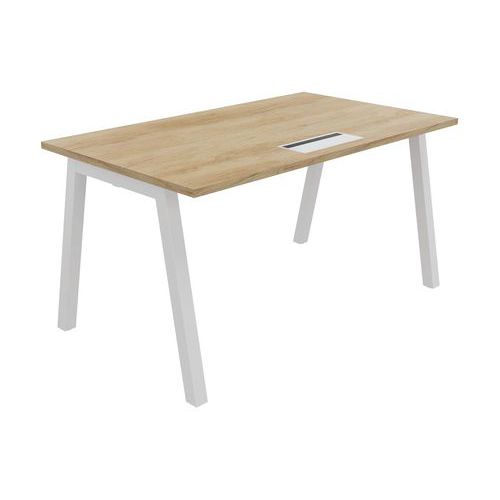 Plateau mélaminé ép. 25 mm, équipé d'un top access de finition assortie au piétement Chant ABS antichoc 2 mm Piétement métallique en arche composé de pieds carrés de section 50 x 50 mm obliques, finition époxy laqué. Vérins de stabilisation pour compenser les défauts de planéité du sol (course de réglage 10 mm)