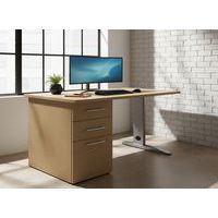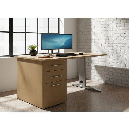 Bureau droit Quatuor sur caisson, prêt à monter avec notice. Patins de réglage sous le caisson. Pied avec vérins de réglage. Pied métal forme L avec passage de câbles sous carter amovible. Caisson porteur à positionner à droite ou à gauche. Caisson porteur profondeur 8 cm, 3 tiroirs dont 1 tiroir pour dossiers suspendus. Plateau épaisseur 25 mm, avec obturateur passe câbles. Hauteur et profondeur bureau 72 x 8 cm. Plateau épaisseur 25 mm, avec obturateur passe câbles.