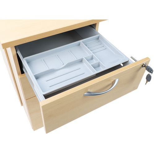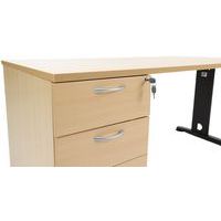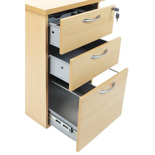 Bureau droit Quatuor sur caisson, prêt à monter avec notice. Patins de réglage sous le caisson. Pied avec vérins de réglage. Pied métal forme L avec passage de câbles sous carter amovible. Caisson porteur à positionner à droite ou à gauche. Caisson porteur profondeur 8 cm, 3 tiroirs dont 1 tiroir pour dossiers suspendus. Plateau épaisseur 25 mm, avec obturateur passe câbles. Hauteur et profondeur bureau 72 x 8 cm. Plateau épaisseur 25 mm, avec obturateur passe câbles.
