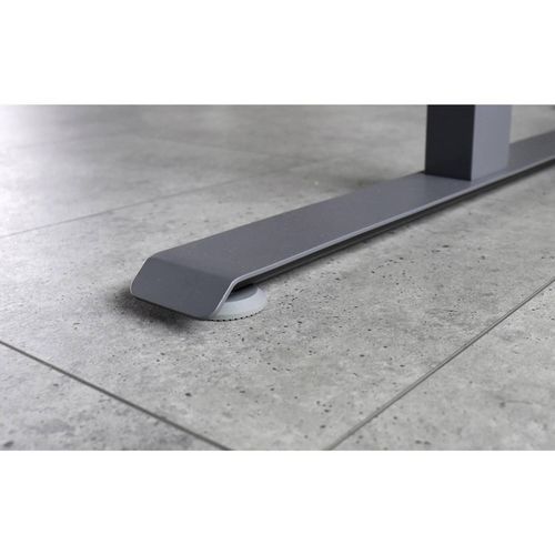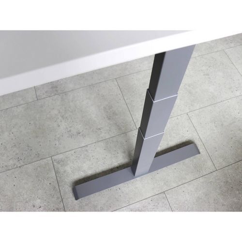 Bureau électrique 180 x 80 cm piétement Gris. Réglage en hauteur, utilisation assis-debout avec une hauteur de travail de 64,5 à 129,5 cm. Pied en T, offre une stabilité accrue et un design moderne. Bureau avec piétement télescopique, hauteur ajustable de 62 à 127 cm sans plateau. Équipé d'un moteur par pied, intégré dans les colonnes à deux niveaux, pour un réglage en douceur et sans effort.