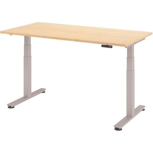 Bureau électrique Série XDSM 160cm. Plateau épaisseur 25mm et rebord renforcé. Piètement en T argenté avec mémoire de positions. Dispose d'un réglage électrique progressif de la hauteur : 63,5-128,5cm. Avec une commande électrique à 2 niveaux, 2 moteurs. Capacité charge: 80kg dynamique, 120kg statique. Livré non-monté, montage simple.