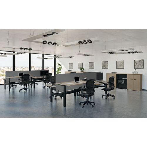 Plateaux mélaminés ép. 25 mm, avec chants ABS anti-choc 2 mm. 2 obturateurs passe-câbles Ø 80 mm. Structures métal télescopiques en tube d acier de section 70 x 70 mm, réglable en hauteur mécaniquement de 65 à 130 cm de haut. Système de réglage en hauteur motorisé, commande de réglage par boitier de contrôle up & down et 4 positions mémorisables. Charge maximale 100 kg / par plateau. Vérins d ajustement sous piétements, pour réglage de niveaux