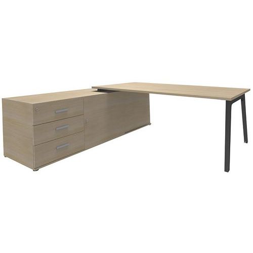 Plateau hauteur 72,5 cm en panneaux de particules surfacés mélaminés haute densité épaisseur 25 mm, chants ABS ép. 2 mm. Piétement arche en acier revêtu peinture avec carters amovibles pour passage de câbles. 2 coloris au choix : chêne clair/pieds blancs ou chêne gris/pieds carbone. Chants ABS antichocs épaisseur 2 mm. Console livrée équipée de 2 tiroirs dont 1 pour dossier suspendus + 1 kit tiroir pour la transformer en 3 tiroirs de rangement.